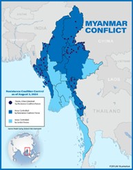 Bien que la résistance ne forme pas un bloc monolithique, elle a réussi à empêcher le Tatmadaw de contrôler l’intégralité du territoire birman. En effet, la résistance a conquis du terrain tout au long de l’année 2023, s’emparant de plus de 180 avant-postes militaires dans le seul État Shan, frontalier de la RPC. Fin 2024, on estimait que la junte du Tatmadaw ne contrôlait plus que 21 % du territoire birman, la majorité de ses possessions se situant en zones urbaines – le plus faible contrôle territorial exercé par l’armée depuis la création de l’État en 1962. À l’inverse, la résistance contrôle 42 % du territoire birman – principalement en zones rurales – les 29 % restants étant disputés entre les deux camps.