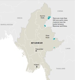 La production de terres rares birmanes est intrinsèquement liée à la Chine. Les mines de terres rares de Birmanie sont concentrées dans les régions Kachin et Shan, au nord du pays, le long de sa frontière avec la Chine. On estime que 30 % de la main-d’œuvre de ces mines clandestines est chinoise. Ces citoyens chinois effectuent les travaux miniers les plus qualifiés, et la grande majorité de la production est exportée vers des entreprises d’État chinoises, telles que le China Rare Earth Group. De ce fait, la Birmanie aurait représenté 57 % des importations chinoises de terres rares en 2024.