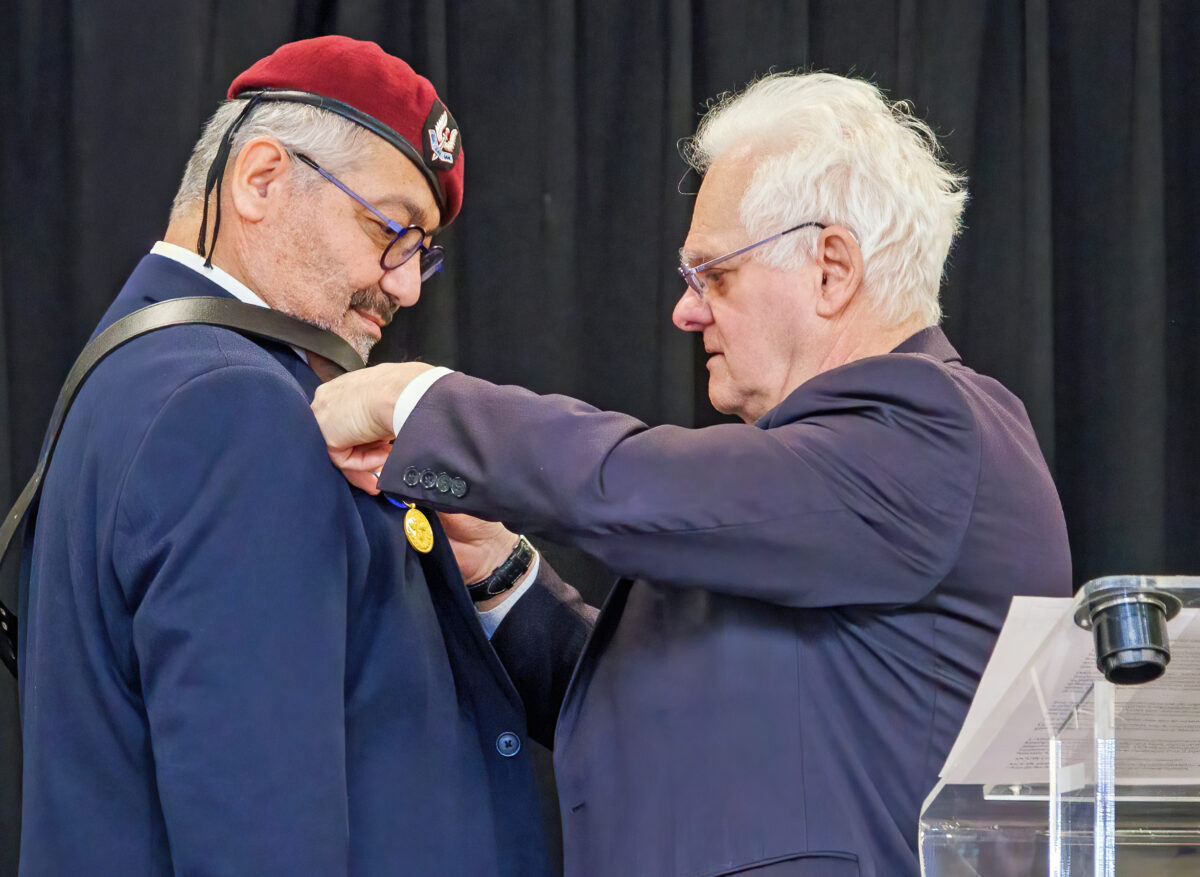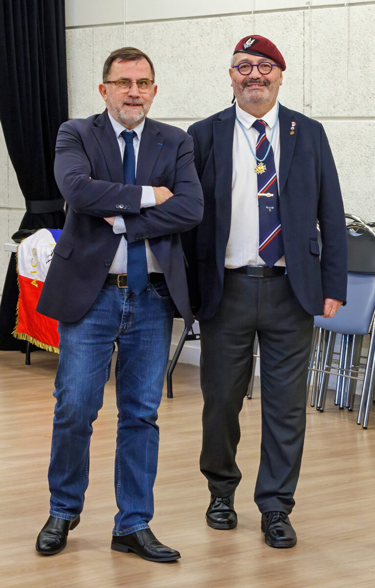 16 décembre 2025 à Noisy le Roi : le Délégué Départemental Ile de France de l’AICS-SR Stéphane Jah reçoit le drapeau et la médaille d’or de l’AICS-SR par Yves Fournier Président de l’AICS-SR